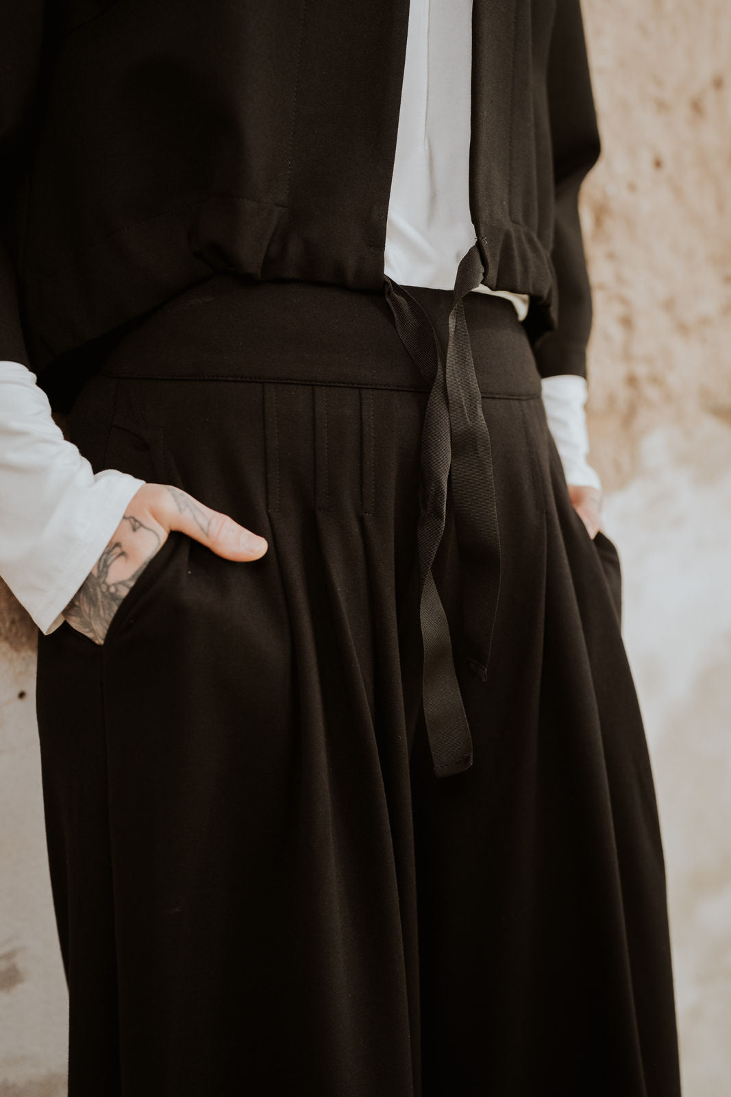 Eine besondere Hose mit extra weiten Beinen. Durch den Formbund und die Falten sitzt die Hose sehr schön in der Taille und wird nach unten hin weit.