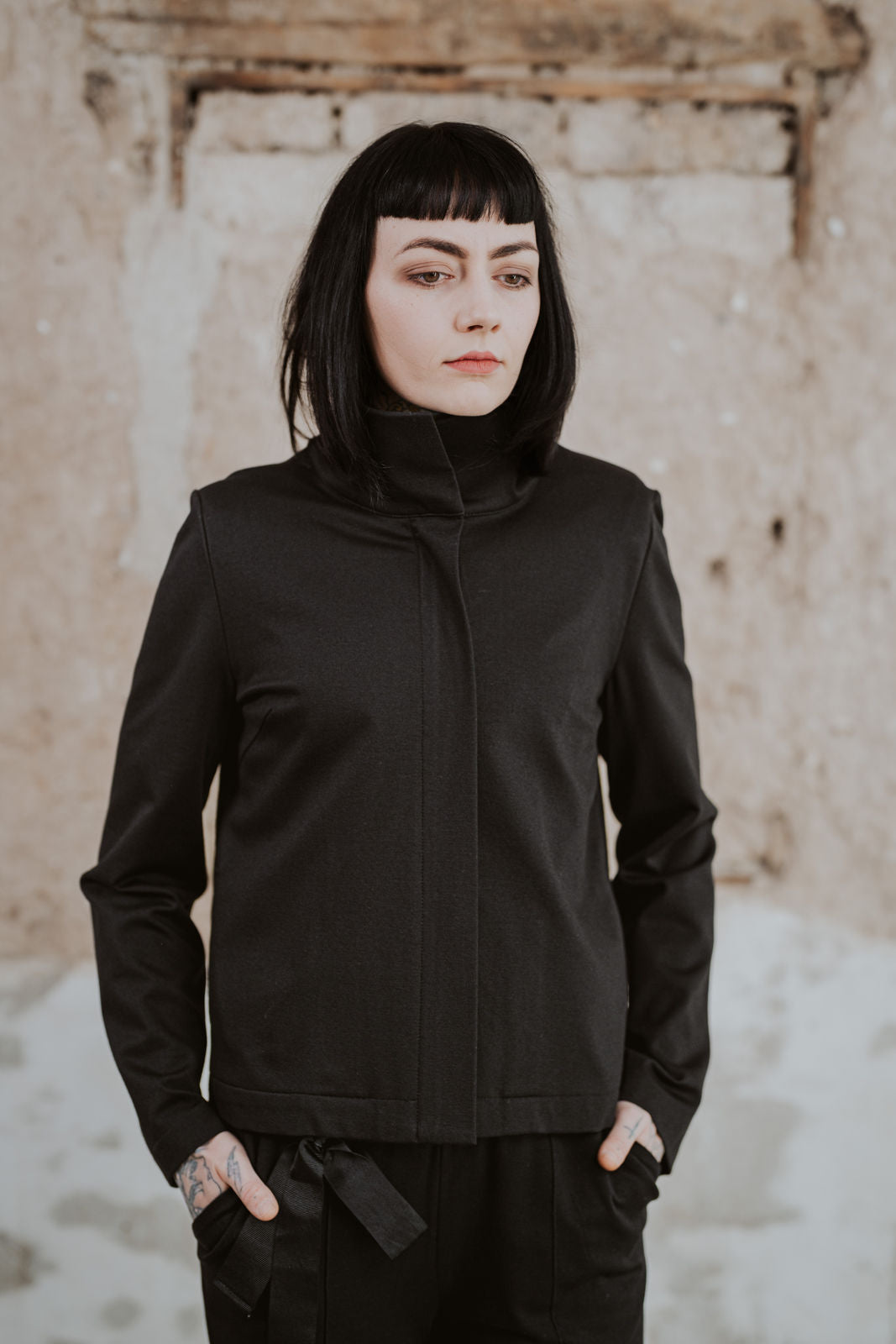 Kastig geschnittene Jacke mit Stehkragen und verdecktem Reissverschluss in der vorderen Mitte.