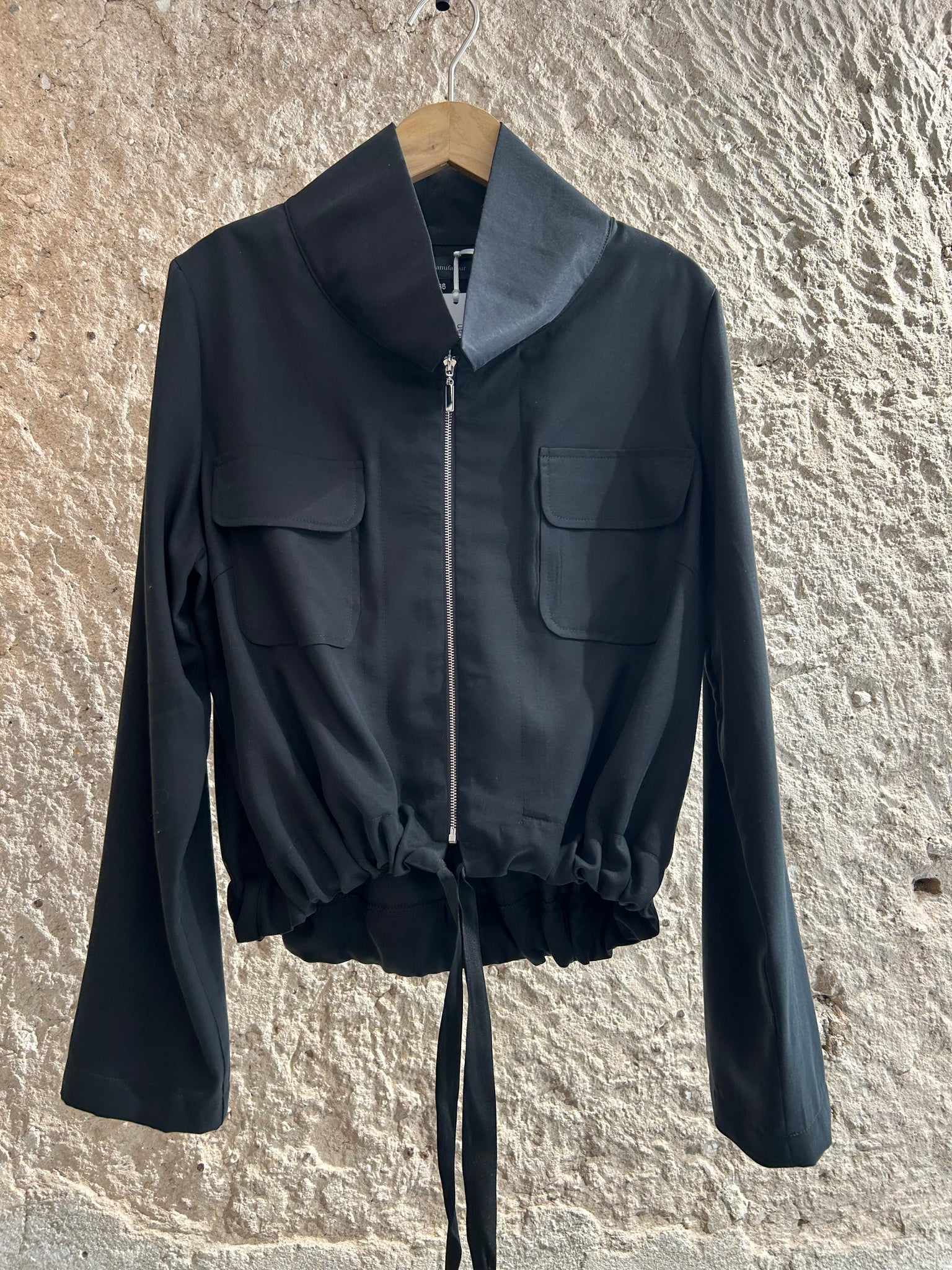 Durch den Tunnelzug am Saum, zusammengezogen ist es eine Blousonjacke, offen gelassen eher lässig legere.