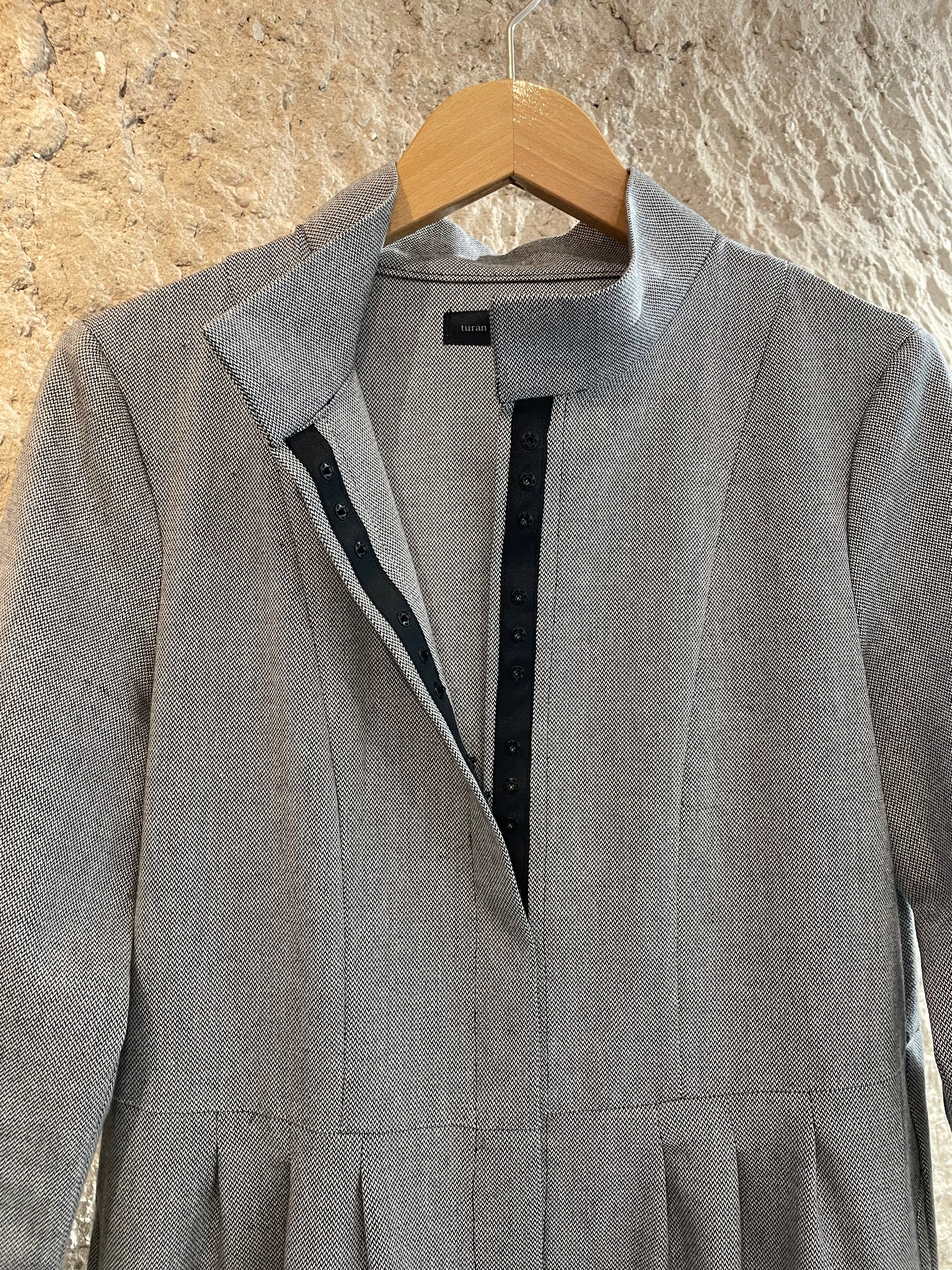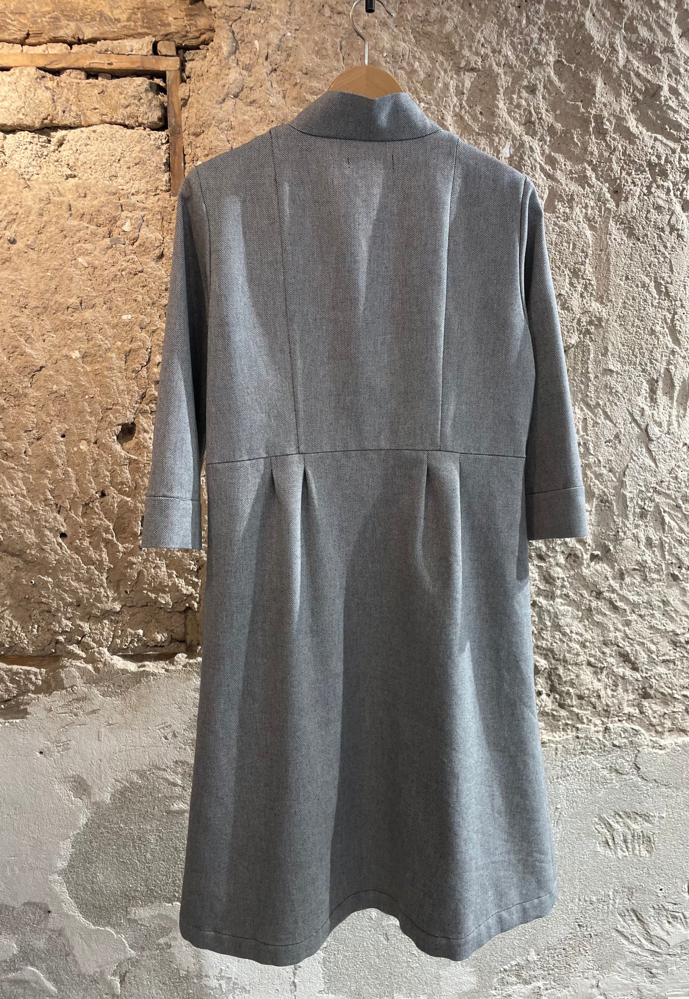 Das Kleid kann auch als leichter Mantel getragen werden, dabei wird die Druckknopfleiste im geöffneten Zustand zum Hingucker.