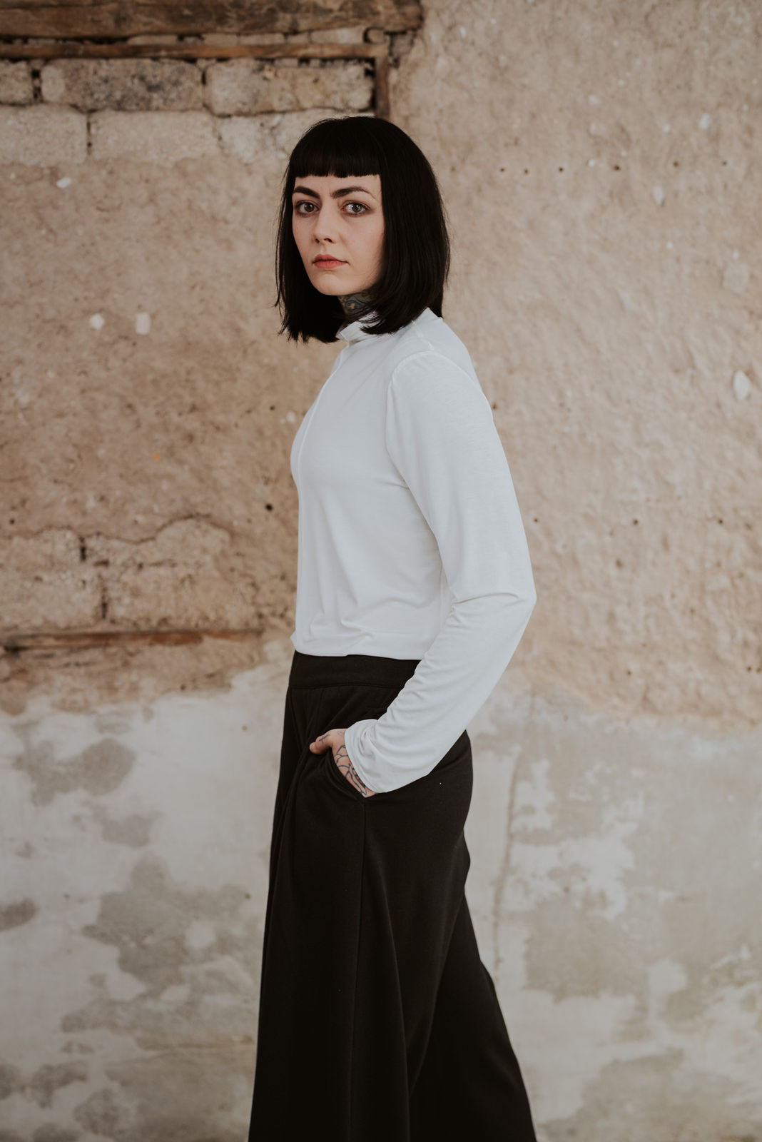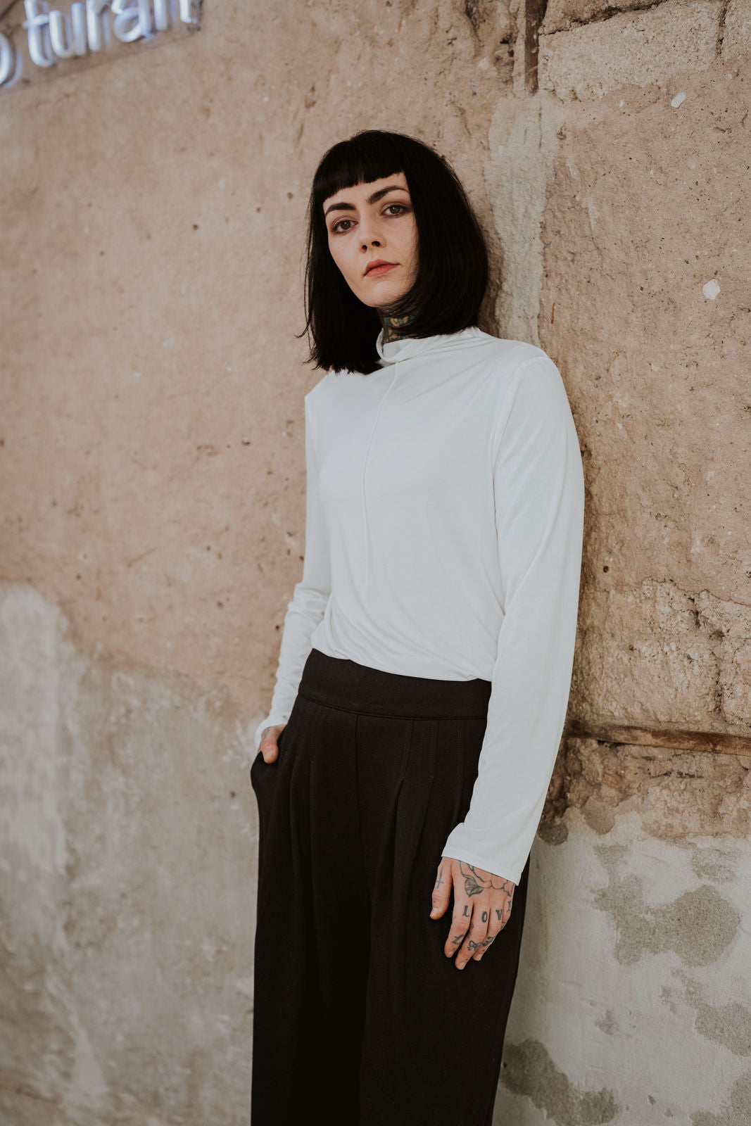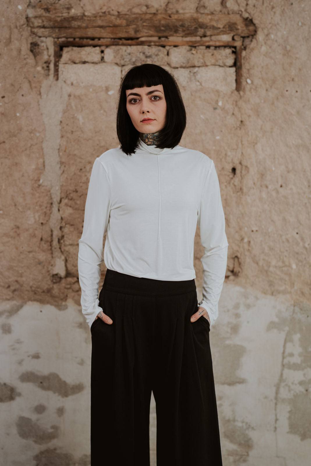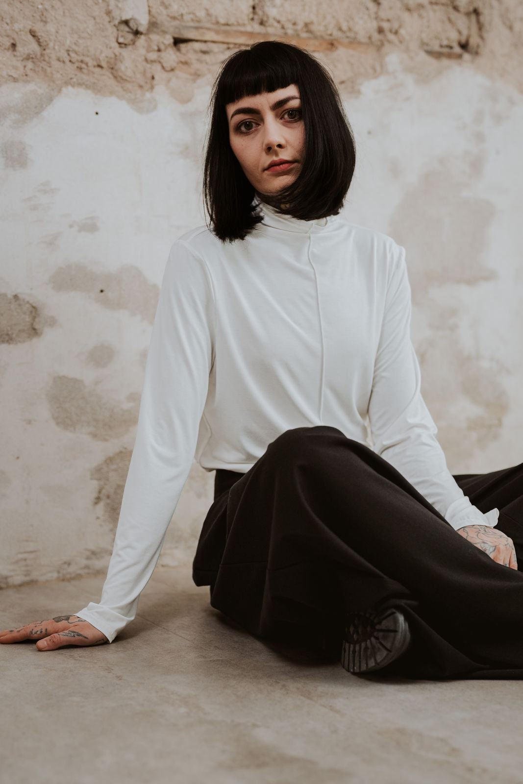 Das Langarmshirt mit Turtleneck ist durch sein Naturmaterial ein absolutes Lieblingsteil. Die Haptik ist unglaublich weich. Das Basic hat im vorderen Bereich eine Biese als Detail.
